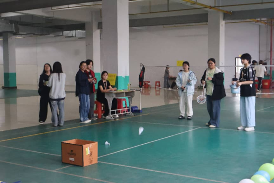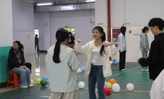 活动现场设有多个创意项目:“颠球接力不落地”考验团队协作,选手们或拍或颠,甚至边颠球边答题,趣味与挑战并存;“羽毛入桶”项目里,高手们精准投球,加赛环节更添紧张刺激;“螃蟹赛跑”中,双人背靠背夹球横移,配合默契者飞速冲线,失误组合的滑稽场面引发阵阵笑声;“你划我猜”在校园主题词卡和“噪音干扰”中考验默契,“就不听指挥”则用反向指令和充气锤惩罚制造爆笑。