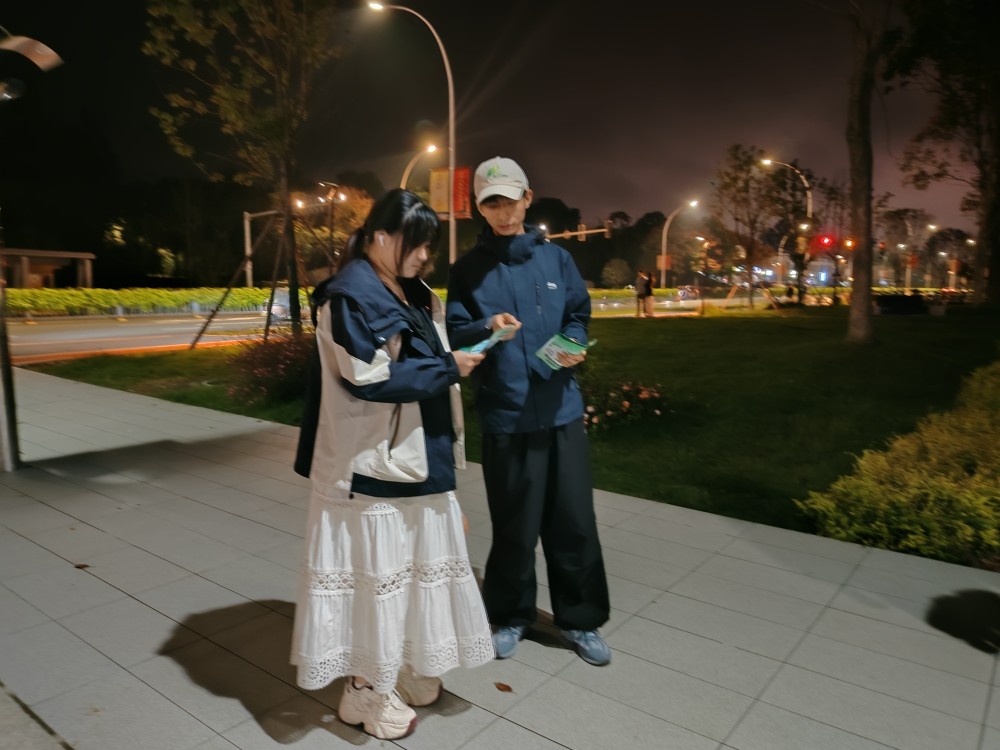 在一栋门前活动正式开展啦,路上的学生们很多,志愿者保持微笑与眼神交流,主动上前时使用礼貌用语,避免强行递送。例如对路人说:“您好,打扰一下,这是关于咱们府澴河保护的宣传知识,里面有简单的护河小方法,您可以看看~”在1栋宣传完后,我们便转移到校门口,志愿者们认真宣讲河流知识志愿者和学生们有效配合,促使本次活动圆满结束。